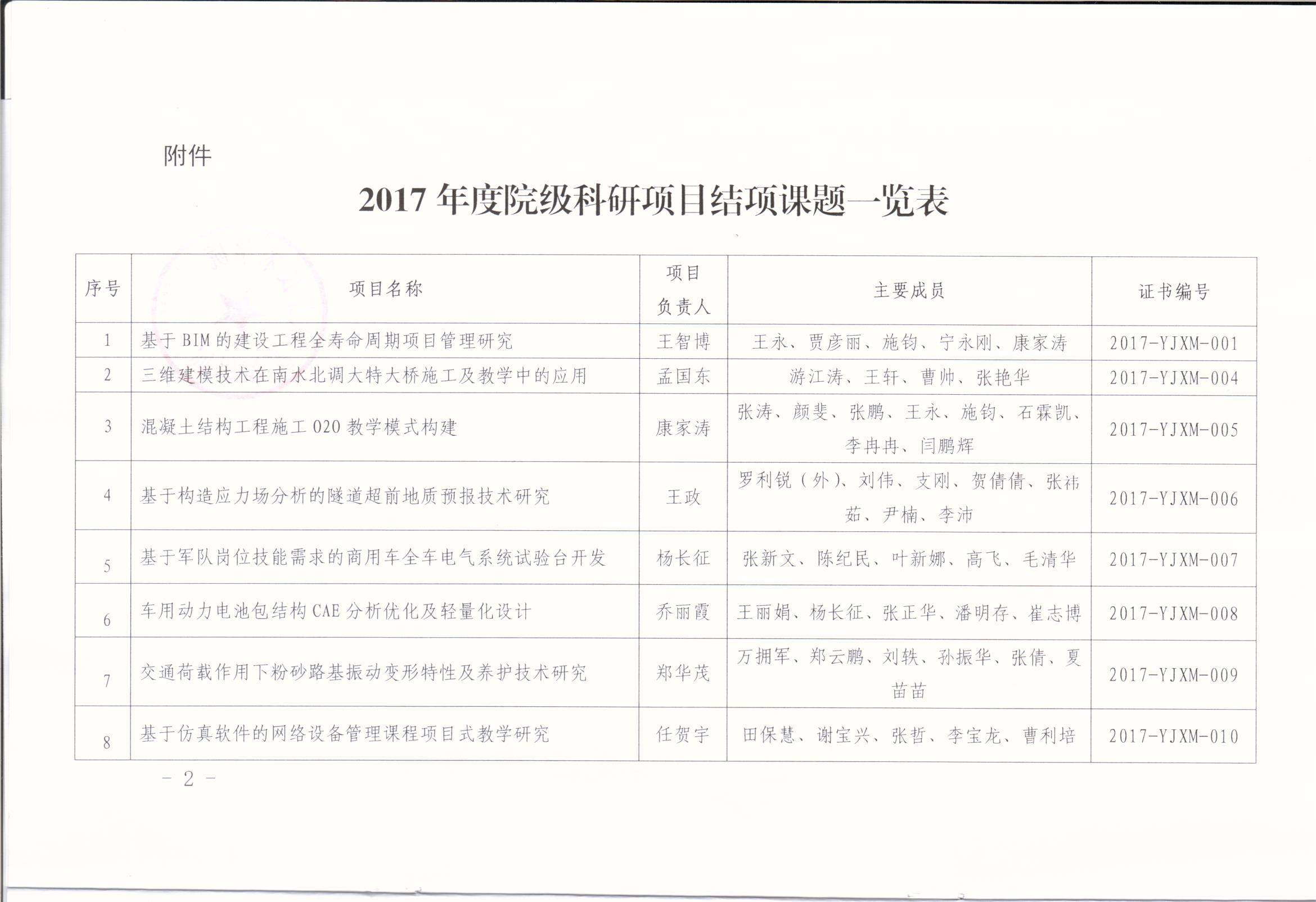 依据《河南交通职业技术学院科研项目管理办法》(豫交院〔2017〕56号)的要求,各系(院、部)、机关各处室、院属各单位先后申报了12项课题结项材料,科研外事处组织学院学术委员会有关专家对这些结项材料进行了严格鉴定与核查,共12项课题验收合格,批准结项。现予以公布。